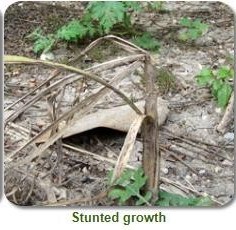 - Infected shoots that survive are severely stunted and yellowish.