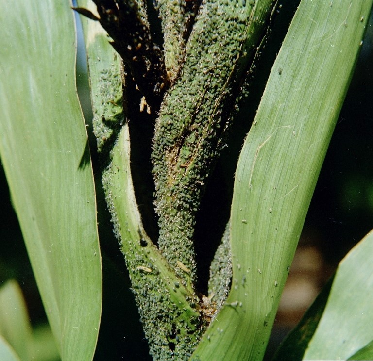 - The aphid colony may sometimes cover completely the emerging tassels and the surrounding leaves preventing the emergence.