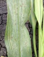 - Small purple to brown oval lesions develop on leaves which later join to kill large portions of the leaf.