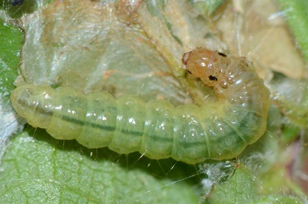 - Green coloured larvae with brown head fold leaves together and feed on chlorophyll.