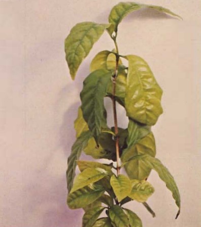 • Interveinal chlorosis in younger leaves with checkered effect/coarse mottling