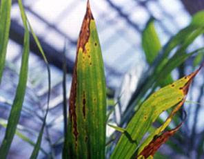 - This disease occurs in the nursery. It is recognized by regular or irregular brown to black leaf blotches surrounded by yellow halos, which develop along the margin, centre or tip of the leaves.