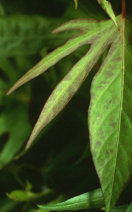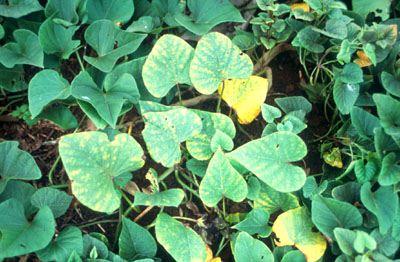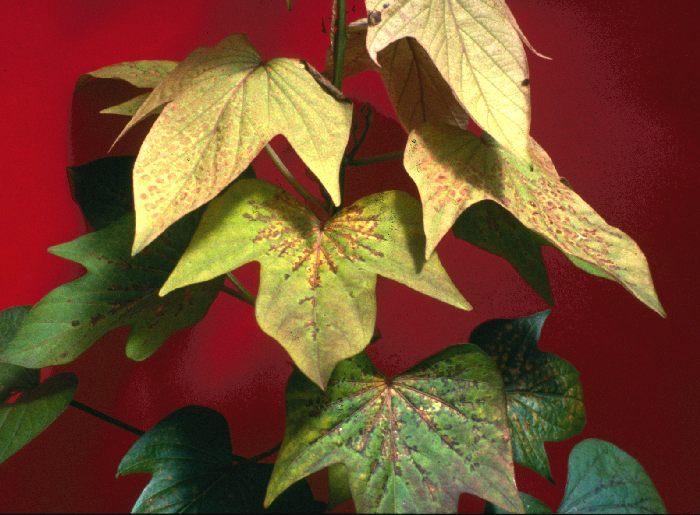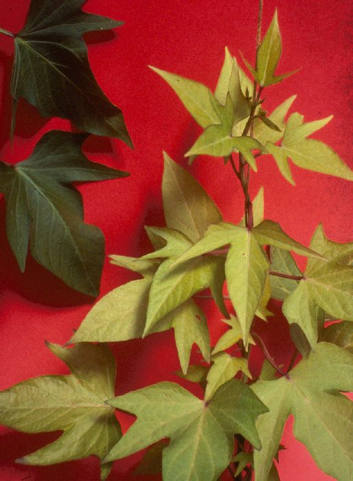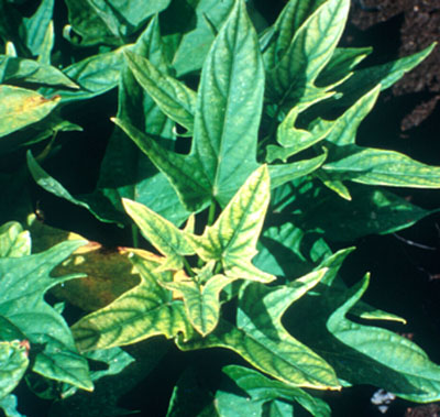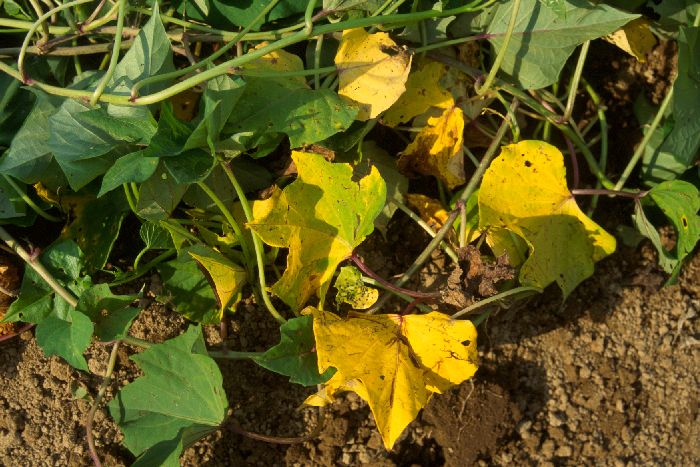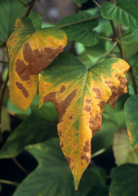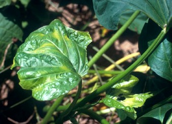 - On the oldest leaves, yellow areas become brown and necrotic, but usually remain soft starting between the veins