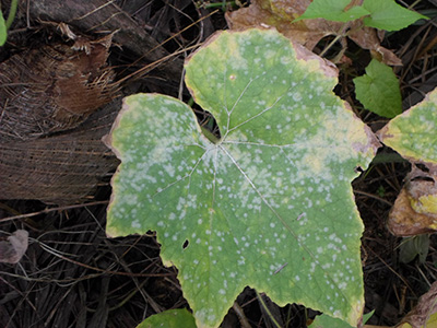 - Small cottony white spots appear on the infected leaves which gradually spread on the lamina.
